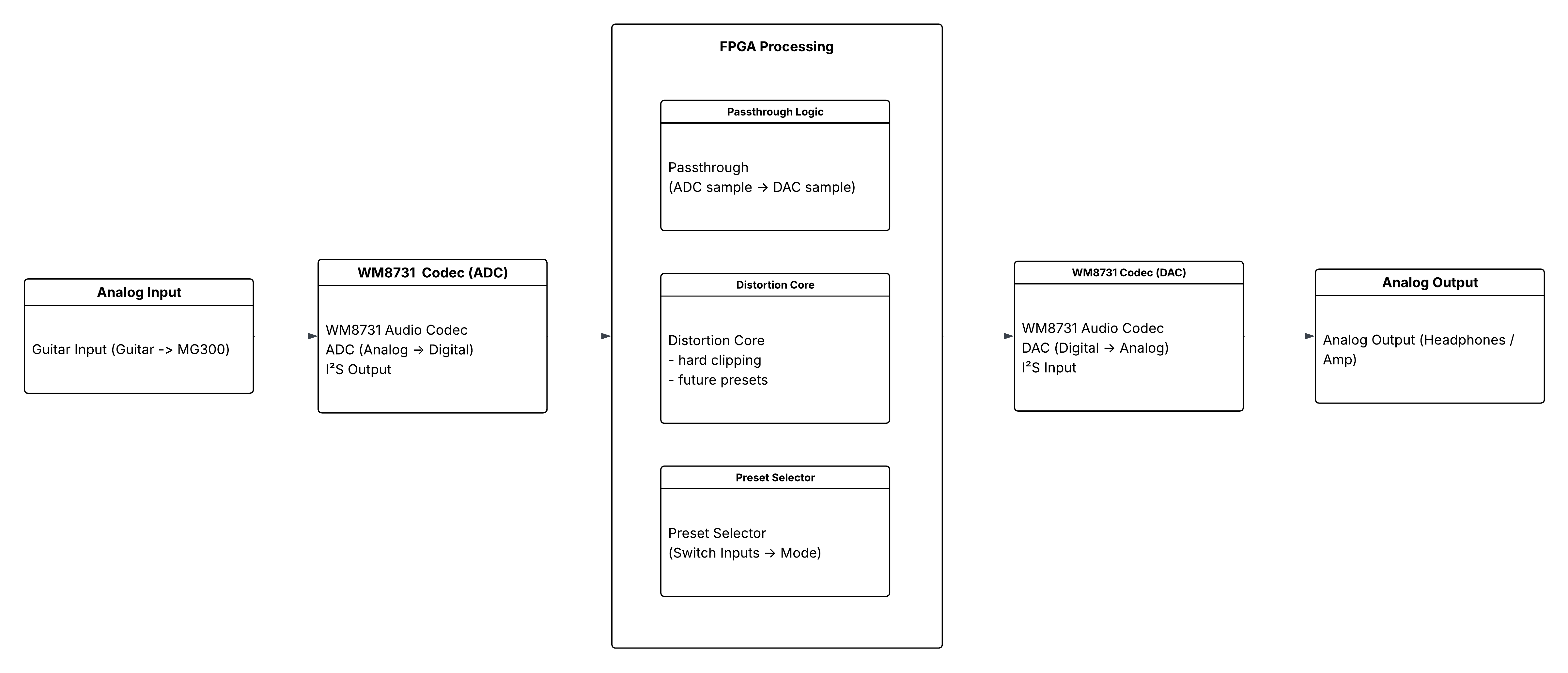 A real-time FPGA audio processing pipeline (ADC → FPGA → DAC) with a distortion module and 4 preset modes controlled by SW[1:0] (00 clean, 01 light, 10 medium, 11 heavy). I also planned an LCD readout so the board shows the current mode while testing.